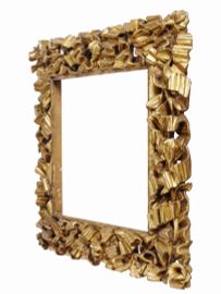 battuta con profilo liscio da cui diparte una grande fascia scolpita a giorno con motivi di nastri incrociati e pieghettati da cui fuoriescono rami, fiori e foglie. Doratura a guazzo in oro zecchino con preparazione a bolo rosso. Luce cm 55x45; ingombro cm 86x75