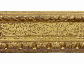 sagoma a cassetta. Battuta a gole lisce, profilo aggettante strigliato con foglie aperte agli angoli, gola liscia, fusarole divise da due perle appoggiano su fascia piatta, abbellita da racemi fogliacei stilizzati su fondo bulinato, profilo di fogliette, gole diritte e rovesce portano a muro. Doratura a guazzo in oro zecchino con preparazione a bolo marrone. Luce cm 97,5x73,2; ingombro cm 121,5x97,2