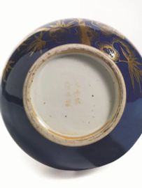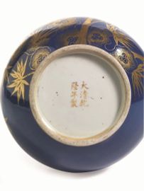 dalla forma a bottiglia in porcellana blu con decori dorati di bamboo e volatili e roccie, alt. cm 28 sulla base recanti marchi Qianlong