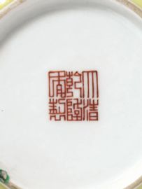 in porcellana a fondo giallo "sgraffiato" decorato con fiori e medaglioni dipinti con peonie , fiori di loto e volatili, alt. cm 21,5 (2)