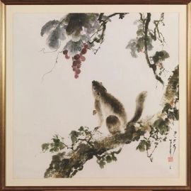 i due dipinti uno raffigurante un gallo cm 52x47,5, uno raffigurante grandi peonia, cm 67x63,5, la la stampa, raffigurante scoiattolo su un ramo, cm62x62(3)