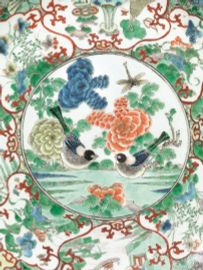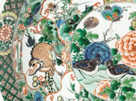 in porcellana policroma della famiglia verde finemente decorati con fiori volatili e animali fantastici, diam cm 34,5, diam cm 35,5 (2)