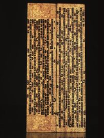 composto di 16 fogli laccati oro con scritte nere in tamarindo in orizzontale con due copertine decorate con motivi floreali nei toni dell oro e rosso, cm 52x11,5