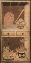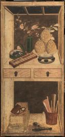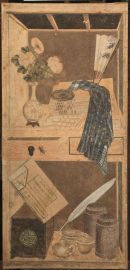 su carta riportata su tela, raffiguranti l'interno di mobili con vasi, fiori, tazze, cm 114x55