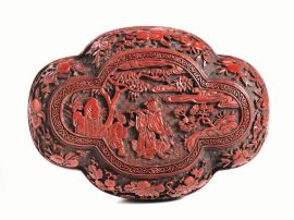dalla forma quadrilobata in lacca rossa, il coperchio finemete decorato con un suonatore di flauto e attendente in un paesaggio entro una cornice sagomata, i bordi e la base della scatola decorati con motivi floreali , cm 16,5x12