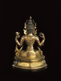 in bronzo dorato raffigurante Avalokitesvara Sadaksari, assisa su una base a doppio fior di loto in vajraparyankasana, le mani principali in anjalimudra, le altre braccia alzate in vitarkamudra, la mano sinistra reggente un fior di loto, e l'altra reggente un gioiello, la divinità elegantemente vestita e ingioiellata con collane con pietre dure, la testa sormontata da una corona, alt. cm 13,5