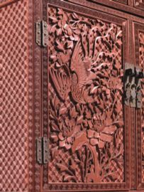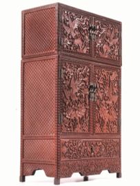 in lacca rossa, a doppio corpo con quattro sportelli e un cassetto alla base, l'interno diviso in scomparti con due cassetti al centro, l'esterno finemente intagliato sul fronte con fenici in volo tra racemi fioriti, i bordi decorati con greche e un ricco motivo geometrico, 35,5x58x16,5
