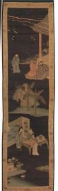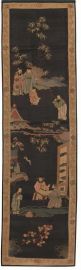 in tessuto kesi, a fondo blu ricamati con fili dorati, e decorati con dignitari di alto rango e figure femminili in un palazzo, cm 116x28 (3)
