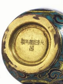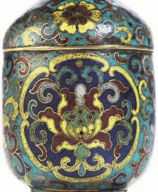 in metallo e smalti cloisonné dalla forma globulare e lungo collo, il corpo decorato con due fiori di loto dischiusi, entro riserve sagomate a fondo blu, circondati da altri fiori di loto e ramages, marchio qianlong inciso sul fondo incise anche le iniziali dalla famiglia LV, alt. cm 9, poggiante su piccola base in bronzo finemente decorata con volatili e motivi vegetali, alt. cm 2