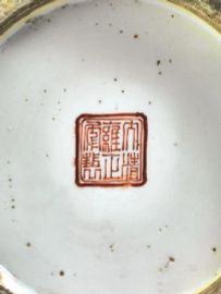 in porcelana policroma, dalla forma Tianqiuping, decorato con il motivo delle nove pesche, con fiori e pipistrelli, recante sulla base marchio qianlong alt. cm 52