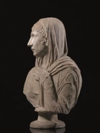 Il busto raffigura una donna di età matura con la testa volta a destra e lo sguardo avanti a sé con un’espressione malinconica. La donna è velata, ma si intravede l’acconciatura di capelli che ricade in onde sulla fronte e sulle tempie con un piccolo ricciolo in prossimità dell’orecchio sinistro. Il volto è caratterizzato da una fronte ampia, con arcate orbitali marcate, gli occhi sono chiaroscurati con indicazioni della palpebra. Il naso è rettilineo e gli zigomi sono leggermente pronunciati, la bocca è piccola con le labbra serrate; due profonde rughe partono dalla parte del naso; dalla testa ricade il mantello in larghe pieghe, tenuto chiuso dalla mano sinistra portato all’altezza del collo; base modanata circolare; il trattamento realistico del volto ne denuncia l’età avanzata.
