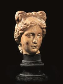 La dea è raffigurata girata leggermente a sinistra, lo sguardo rivolto verso il basso, i capelli molto mossi si separano sulla fronte in piccole ciocche ricadenti e sono divisi al centro per riunirsi in un nodo alla sommità della testa e in uno chignon annodato sulla nuca e sono ulteriormente fermati da una sottile tenia; la fronte è ampia, le arcate sopracciliari in evidenza con occhi fortemente chiaroscurati con indicazione della palpebra; il naso è rettilineo, gli zigomi appena rilevati, la bocca è piccola e con labbra carnose leggermente socchiuse, mento appena pronunciato; le orecchie sono in gran parte coperte dalla capigliatura