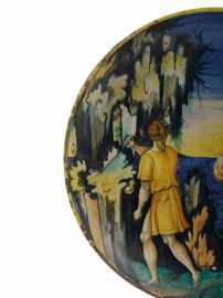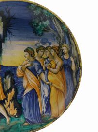 On the back, beneath the base, a typewritten paper tag: piatto d’Urbino/ scena mitologica/ il giudizio di Paride; remains of a wax seal not readable