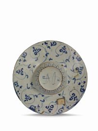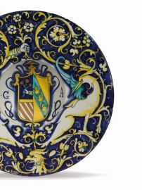 Earthenware painted in blue, orange, copper green, antimony yellow on a creamy-white glaze.