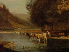 In this extraordinary masterpiece, the foreground in shadow (with the threadlike greenery that reaches the water and that will be seen again around 1875 in his paintings of ponds, along with a very essential and incisive way of painting, incredibly avantgarde for the time) creates the effect of a visual telescope: it emphasizes the magic light that falls on the animals wading across the stretch of water and that also arrives from the right, illuminating in full sunlight all that horizontal area of the painting, with the firm figure of the shepherd against the light and the rest of the cattle illuminated that moves across the sand towards the mottled, crystal clear surface of the water. This appears as calm as the meander of a lake but also rippled by a slight current, which is expressed by the colour tone vibrations of the paint that convey the thousand refractions of light onto a wonderfully vibrant surface that multiplies the variations of azure, silver, gold and the delicate browns of the reflections of animals and trees.