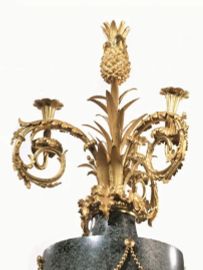 Further supporting the attribution of these two girandoles to Duplessis is the comparison with the pair of girandoles published by Kjellberg with an attribution to Duplessis (fig. 2), which bear almost identical motifs on the leaf-like arms centred by a large branch terminating in a pineapple, as well as an identical green granite base resting on a gilded-bronze square plinth; the lot we are offering here features fewer arms, and this fact, together with the rather sober pearled chain substituting the rich leafy decoration which runs down from the bights to the base, seems to bring the present artefact closer to a phase in which neoclassical taste was beginning to become more decidedly preeminent.