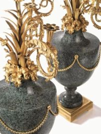While two of these girandoles have already been identified as those sold at an auction at Christie’s in 2007 (fig. 1), the lot presented here – similar in everything to the former save for the colour of the granite, green instead of gray – could well complete the foursome commissioned by Laurent Grimod to decorate the palace designed for him by the architect Jean-Benoît-Vincent Barré, considered among the founders of the Louis XVI architectural style.