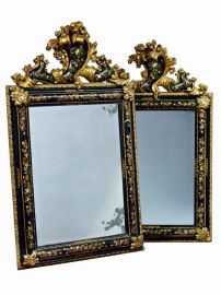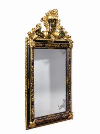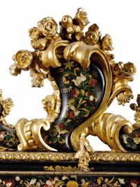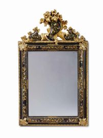 PAIR OF MIRRORS, VENICE, SECOND QUARTER OF THE 18TH CENTURYPAIR OF MIRRORS, VENICE, SECOND QUARTER OF THE 18TH CENTURY in ebonized, lacquered and gilded wood with mother of pearl marquetry and foliage in sculpted and gilded wood, 168x98 cm This pair of frames is a typical and refined expression of the early rococo atmosphere in Venice during the second quarter of the 18th century. This was a moment in time in which the gilded mirror passed from being mostly used for private grooming to constituting a furnishing element in its own right, over a progressive process of emancipation. During this still transitory phase, during which each city exhibited its own decorative techniques, Venice became one of the main protagonists, laying the foundation for a decorative style that will constitute a key influence for the coming decades. Over the course of the 18th century, the creation of these artefacts is so deeply rooted in the venetian lagoon that within the guild of the marangoni, or woodworkers, there developed a specific branch of highly specialized master carvers, the marangoni de soaza. At the same time, there was a multiplication of workshops managed by soaza artisans: 36 workshops with 94 masters, 124 workers and 24 helpers according to a 1773 statistic polled by the magistrates and trade regulators of the Savi della Mercanzia. The venetian masters did not shy away from letting their creativity run loose, using an ornamentation technique at which they excelled, enamelling, in which the decoration, drawn on a monochrome stucco base is then polished with a layer of varnish, called sandracca. It was in this way that the same kinds of ornamentations which decorated chests and other furnishings went on to embellish mirror-frames, animating them with exotic themes, or chinoiserie. A particular predilection is reserved for decorations modelled after flowers and of oriental inspiration which, drawn vividly and with narrative gusto, stand out with their rich colours against the neutral, often dark backgrounds, alternated with branches and leaves and creating an exuberant but at the same time composedly elegant picture. When a given commission is particularly important, these decorations may also be further enriched by evocative pearl inlays, as with the red and gold lacquered wood frame made in Venice at the end of the 17th century and currently held in the Gemäldegalerie in Berlin (fig. 1), or the one probably dating from the early 18th century and held in a private collection (fig. 2). It is also the case of our two frames, which were probably requested by an important family for a significant occasion. The combination of lacquer and pearl was a venetian prerogative between the late 17th and early 18th centuries. Many carvers produced this kind of decoration, among whom we must mention the architect, engraver, carver, and inlayer Domenico Rossetti, famous for his “works with pearl and in the Chinese style”. This pictorial richness was paralleled by an equal sculptural vivacity, which expressed itself – as well as in the creation of frames in a wide array of styles and shapes – in adding further elements of carved wood to the frames. Additions in sculpted and gilded wood are often attached to the four outer corners of the frame. We can see this in our pair’s ogival motif, creating a kind of counter-frame which was supposed to make the mirror stand out against the wall. But a greater importance is without doubt given to the coping, a necessary crowning of the upper part of the mirror. In the carving of this component, the venetian masters let their creative imagination run wild, showing off their whole repertory of leaves, shells, festoons, and, as in the present case, cartouches, often made so that they would hold a family crest or, as is the case here, decorated with the same pictorial motifs embellished with pearl that are found on the main body of the frame. Almost as if replying to the painted floral motifs, the coping is populated by elements in painted and carved wood, made with a mastery fully on par with that of the expert and imaginative master painters. In our mirror-frames, flower and fruit alternated with leafy folds frame the central coping, the asymmetrical position of which creates a decentred effect typical of the 18th century, whilst the four corners of the frames are marked – symmetrically this time – by small sculpted and polished folders in the middle of the pearl component. And whilst often in this kind of mirror-frame the sculptural element tends to dominate over the pictorial one, concentrating the focal point of attention on the coping, here the overall composition is characterized by a marked equilibrium, in which all elements, both sculptural and pictorial, cohabit and form a harmonious whole. In this sense, these mirror-frames can be fully included in early rococo production, when the festive and daring baroque evolved into lines which – whilst still dominated by an inventive force and capricious exuberance – reflected the period’s more graceful and refined taste. During these few years, many sculptors and woodcarvers place their art in the service of frame-making, including Antonio Gai, Antonio Corradini, or Andrea Brustolon, noted for having made multiple frames alongside the furnishings for the Venier family, now held in Palazzo Rezzonico. Following his drawing, the luxurious throne for the church of the Gesuati in Venice was made in the early 18th century (fig. 3). Its precious pearl inlays, together with its folds and rich wooden sculpted and gilded flowers, constitute one of the first examples of a decorative taste which will exercise much influence over the following decades. Our mirror-frames, thus, may be included precisely in this current. Comparative literature G. Mariacher, Specchiere italiane e cornici da specchio, dal XV al XIX secolo, Milan 1963, pp. 16-24; E. Colle, Il mobile barocco in Italia, Milan 2000, p. 332; C. Santini, Mille m
