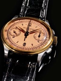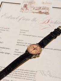 Cassa in acciaio con fondello a scatto, lunetta e corona in oro rosa 18 kt, pulsanti cronografici rettangolari. Quadrante rosè con indici e numeri arabi applicati oro, scala tachimetrica e divisione dei cinque minuti periferiche, due quadranti ausiliari ad ore 3 e 9 rispettivamente con registro dei 30 minuti e secondi continui, lancette a foglia oro, secondi cronografici neri al centro. Movimento a carica manuale calibro 13''', cassa, quadrante e movimento firmati
