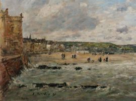Boudin exhibited for the first time at the Salon in Paris, with his work Le Pardon. In the summer of 1862 he painted his first beachside, a subject that, in its never-ending atmospheric variations, was to characterize his oeuvre. Over time, Boudin’s canvases kept to the same subjects, changing them according to the time of day: Plage aux environs de Trouville (1864) or Concert au casino de Deauville (1865) are examples of this group of works. Besides this genre, in the 1870s in particular, he also devoted himself to portraying the middle-class during their leisure time. The main locations of these works were the beaches and the new recreational facilities popular with the wealthy: the subject of these paintings is therefore, once again Normandy, where Boudin would spend half of the year, returning to Paris only for the winter. In December 1870 he moved to Bruxelles, summoned by the art dealer Gauchez, and worked there throughout 1871, also travelling to Antwerp, Bordeaux and the Netherlands, so as to vary his production. With the art market crisis in the middle of the 1870s, moving became more difficult; he started travelling again in the 1880s, until he moved into the house he had had built in Deauville, Lower Normandy: here the colours of his palette maintained a certain darkness, reflecting the weather of those northern lands. In 1874 he took part in the exhibition of the Impressionists in studio of Nadar. Several years later, in 1883, Paul Durand-Ruel, the first art dealer to understand the importance of Impressionists and a great admirer of Boudin’s work, dedicated a very successful exhibition to him in his new gallery in Boulevard de la Madeleine in Paris. Only in 1892, when for health reasons Boudin moved to the south, to the French Riviera, did his palette become lighter: he felt however incapable of translating the light of those lands and that sea into his painting. He will spend the following years between the French Riviera, Venice and Florence; he died in his beloved Deauville in August 1898.
