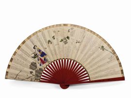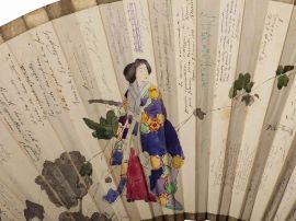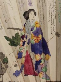 The oldest “souvenirs” date back to 1883. They include two watercolours by Giacomo Favretto, one on each side of the fan, with the portrait of the Japanese lady in kimono bearing the date “1883” under the signature of the artist. The ornamentation of this side of the fan, characterised by flat areas of colour, also includes a floral decoration consisting of branches of flowers and leaves in silver and green, and a small sparrow in flight. On the opposite side, Favretto painted an intense portrait of a lady characterised by muted colours (perhaps Amalia herself?), and purple branches scattered with large flowers and birds in fuchsia and gold. The expression of the woman, who has dark hair and wears a lilac-coloured shawl, is languid, her eyes almost sleepy and her lips slightly parted in a smile.