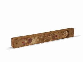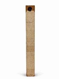 in white paper with top and bottom edges in gold, wooden frame lacquered in red with floral decoration in green and gold on the supporting slats. Width of the open fan: 91 cm. Height: 50 cm. Kept in a specific wooden box with lid (53.2 x 4 x 6.5 cm) with handwritten heading “Gentil Signora Amalia Tibaldi, Verona” and wax seals (one with initials “GV”). The inside of the lid bears a glued white paper strip with a partial list of the names of the authors of dedications and autographs, presumably drawn by the owner of the fan, and complemented by two loose sheets with lists of names stored on the bottom of the box. Light wear.