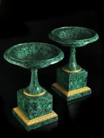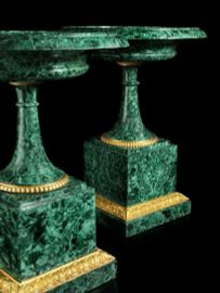 Malachite artefacts are characteristic of the rich and refined taste of early 19th century Russia. Master craftsmen worked on this material using the “Russian mosaic” technique: they cut it up into small plaques which they then melded together and polished, creating the illusion that the object was made out of a single block of material, thanks also to the subtle interplay of lines produced by the veins of the stone. These artefacts were often embellished using rich gilded bronze framings, which created wonderful effects of light and contrast.