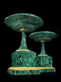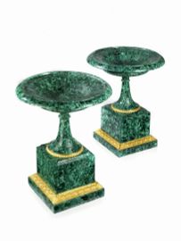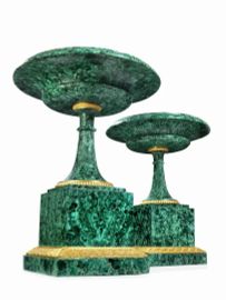 Malachite and gilded bronze; the rounded and contoured cup is melded to a turned foot which rests on a plinth-shaped base; the various parts are connected and embellished with a finely chiselled and gilded bronze framing; height 53.3 cm, diameter 41 cm, base 25x25cm