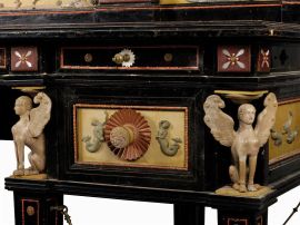 Wedding desk decorated with Corals, Tortoiseshell and Sculptures made of Antique Stones of Pompeii and Lavastones of the Mount Vesuvius etc.; the colors are all natural – created in 1891 by the R a Scuola d’Incisione sul Corallo of Torre del Greco (Naples) as prototype of a new Artistic furniture in Neo-Pompeian style; awarded with Golden medal at the National Exhibition of Palermo -1891- and with another Golden medal at the Italo-American Exhibition in Genoa -1892-.