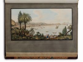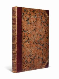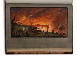 Folio (460 x 335 mm). Typographical title page; hand-coloured double-page map of the Bay of Naples, engraved in 1776 by Giuseppe Guerra after Pietro Fabris; [1] l. with “References to Plate I”; hand-coloured chalcographic title-page with six vignettes depicting the Aeolian Islands; pp. 3-90; [1] l. with imprimatur; typographical title page; [53] ll. of text alternating with [53] hand-coloured chalcographic plates numbered II-LIIII; typographical title page of the Supplement; [1] l. with “References to Plate I”; hand-coloured chalcographic title-page with six vignettes depicting the eruption of Vesuvius; pp. 1-29 [1]; [1] l. with a dedication to Ferdinand IV; [4] ll. of text alternating with [4] hand-coloured chalcographic plates numbered II-V. Complete. Contemporary long-grain red half morocco; spine with six nerves and seven finely gilt compartments, the second with gilt lettering; marbled covers, endpapers and edges; gilt floral roll on covers. Occasional pale age-toning, binding slightly rubbed, but overall a very good copy.