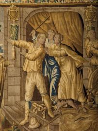 in lana e seta, completo di ricca bordura interamente decorata con fiori e vasi, raffigurante scena con figure. Sulla sinistra un soldato con spada e cappello piumato rivolge il braccio alzato verso due signore nell’atto di allontanare un giovane dal palazzo, mentre alle loro spalle un altro giovane con due pugnali nelle mani è trattenuto da una donna giovane ed una anziana: la scena si svolge nel portico di un palazzo nobiliare. Tutt’intorno corre una preziosa bordura, parzialmente integrata, che alterna nella decorazione vasi, stemmi e trofei architettonici a fiori sparsi o raccolti a mazzi; cm 268x340