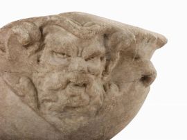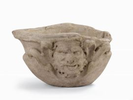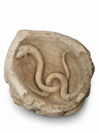in marmo bianco a grana fine scolpito e levigato e rifinito a trapano; vasca di forma ellittica decorata all’interno con due serpenti che si intrecciano, resi a bassorilievo; sui lati si trovano due mascheroni di satiro ghignanti e barbati, uno giovane ed uno anziano, inquadrati da volute vegetali, cm 37x34x21. Lacune e mancanze