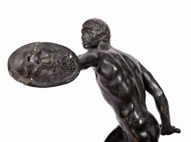 Realizzata in bronzo a patina marrone, raffigura gladiatore su base gradinata in marmo; in equilibrio sulle due gambe, il lottatore è ritratto nel gesto di proteggersi dall'attacco dell'avversario, brandendo nella mano sinistra lo scudo, la cui superficie esterna si presenta decorata a rilievo con un volto maschile barbuto, mentre con la destra stringeva una spada, oggi perduta. L’ispirazione di questa scultura è probabilmente da rintracciare nei modelli antichi, come sembra suggerire il confronto con il Gladiatore Borghese oggi conservato al Museo del Louvre