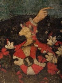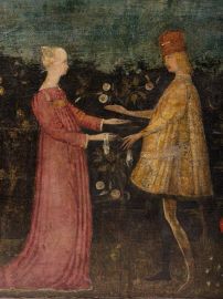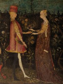 La delicatezza tardogotica delle figure, caratterizzata da cadenze quasi fiabesche che si coniugano a una grande attenzione al naturalismo, suggeriscono di avvicinare il nostro cassone alla cerchia di Pisanello, inserendolo dunque nel contesto dell’Italia settentrionale di inizio secolo XV. Il fronte è interamente dipinto con una scena continua che si svolge all’interno di un giardino in fiore, una sorta di hortus conclusus, tipica ambientazione di dipinti sacri che vedono come soggetto principale la Madonna (si veda ad esempio, dello stesso Pisanello, la Madonna della Quaglia del Museo di Castelvecchio a Verona), probabile allusione, in questo caso, alla castità della sposa. Al centro del giardino è il blasone della famiglia Fanzago di Clusone in val Seriana, con uno stemma coronato da una mano giurante, grembiato da otto pezzi di rosso e argenti e caricato in cuore da uno scudetto rotondo d’azzurro alla torre d’argento merlata alla guelfa, aperta e finestrata di nero. Ai lati dello stemma due coppie di giovani, riccamente abbigliati secondo la moda tardogotica, sono raffigurati di profilo l’una verso l’altro in atto di sollevare le braccia per prendersi le mani. I fianchi, infine, presentano un decoro a racemi stilizzati di foglie che inquadrano ricche melagrane