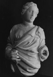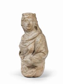 Il nostro marmo, infatti, s’imparenta strettamente con un busto inedito di collezione privata che rappresenta una figura femminile coronata in atto di sorreggere una spada, identificabile dunque nella Giustizia, del tutto simile nel taglio mistilineo, nelle cadenze del panneggio e nella mano artigliata, come anche nella mancanza dell’altra mano: opera già orientata verso la gioventù di Jacopo da Giancarlo Gentilini (relazione inedita, 1989). Inoltre, i due marmi qui riuniti trovano efficaci riscontri fisionomici, nelle grandi orbite dilatate, posturali, nell’accentuata torsione del polso e nell’arpeggio delle dita, e pure nella particolare ricaduta del manto sulla spalla sinistra, con altre due mezze figure di identica tipologia sagomata raffiguranti la Temperanza e la Fortezza (Parigi, Galerie Ratton & Ladrière) recentemente riferite da Francesco Caglioti (op. cit. 2010) proprio a Jacopo della Quercia (la Temperanza, poi riprodotta anche da retro in Galerie Ratton & Ladrière, D’Agostino di Duccio à Caffieri, catalogo della mostra, Parigi 2012, pp. 10-11) “e aiuto” (la Fortezza) con una datazione intorno al 1410-1415.