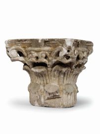 in calcare bianco scolpito, levigato e rifinito a trapano, con tracce di doratura. Piccolo capitello di ordine corinzio, decorato al centro dell’abaco con una voluta di foglie di acanto e nella parte superiore del kalathos con due gruppi di volute contrapposte, mentre sul fusto con due ordini di otto grandi foglie sovrapposte. Sulla faccia superiore, un cerchio inciso a compasso e scompartito in spicchi; alt. cm 27. Numerose lacune e mancanze, doratura di epoca posteriore