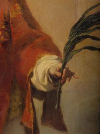 Anche la vivace cromia, più ricca e pastosa che non in Gaetano (come già sottolineava la Bianchi) ritorna, per ovvi motivi liturgici, nel San Lorenzo che insieme ad altri santi assiste in estasi all’apparizione di Cristo nell’imponente e bellissima pala di Medicina del 1766, e ancora nel Vescovo nella pala di Riolo, dell’anno precedente.