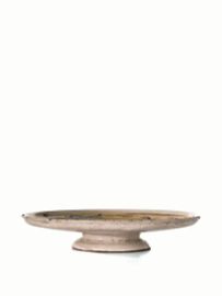 in maiolica decorata in policromia, piatto a fondo liscio con bordo rialzato e breve dall’orlo arrotondato, poggiante su un piede alto poco svasato. La decorazione interessa l’intera superficie del piatto e descrive una scena di caccia: in un ampio paesaggio caratterizzato da un grande albero con chioma larga e da un casolare con tetto a cuspidi, entrambi inseriti in uno scenario di montagna, un cacciatore con cappello armato di archibugio e accompagnato da un cane bianco affronta un centauro con arco spiegato, anch’esso accompagnato da un cane. Alt. cm 5, diam. cm 25,5, diam. piede cm 11,5