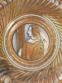 in maiolica decorata in blu di cobalto, con lumeggiature a lustro dorato, di forma tipica: il piatto doveva cioè sorreggere nel centro un versatoio, a imitazione del vasellame metallico. Al centro della composizione un ritratto muliebre di profilo con un cartiglio contenente la scritta “BERRARDINA”, mentre nel resto del cavetto si sviluppa un decoro a baccellature arcuate, delimitate da sottili pennellature blu e ombreggiature. La tesa mostra il caratteristico decoro a piccoli frutti tondeggianti disposti a linea continua. Il retro è decorato da linee concentriche gialle con tracce di lustro. Prossimo al nostro esemplare è il bacile con ritratto femminile del Fitzwilliam Museum di Cambridge, proveniente dalla collezione Pringsheim (vedi O. von Falke, Die Majolikasammlung Alfred Pringsheim in München, Leida 1923, p. 78 n. 145). Alt. cm 3,4, diam. cm 33, diam. umbone cm 11