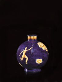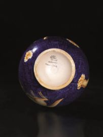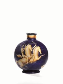 Vaso in maiolica policroma a fondo blu intenso con figurazione giallo-bruno