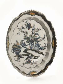 in maiolica policroma con ampio cavetto piano e tesa rilevata con orlo sagomato; il fronte presenta una bella composizione decorativa orientale con un cesto di frutta, motivi a graticci e fiori all’orientale, a riprendere il motivo “al ponticello”. Sul bordo una fascia a rocaille lumeggiate in giallo e verde completa il decoro; alt. cm 6, diam. cm 47