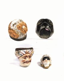 in smalto e metallo variamente sagomate: una in forma di testa di cane da caccia; una come testa di turco, impreziosita all’’interno con un ritratto di un regnante, databile al 1765 circa; la terza raffigurante la testa di una foca, decorata all’interno con una scenetta con una donna seduta con un moschetto intenta a accarezzare un cane da caccia; l’ultima in foggia di volto di dama con gli occhi coperti da una maschera, gli occhi lumeggiati con brillantino (uno mancante), la chiusura in metallo dorato decorata da una raffinata incisione, che trova confronto in esemplari francesi di porcellana databili attorno al 1830