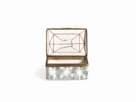 in smalto con montatura in metallo, decoro a fitta trama di nero a formare un motivo a raggiere evanescenti. All’interno del coperchio, al centro di un intreccio di linee geometriche rosse, l’immagine di una busta da cui emerge l’angolo di una lettera; cm 4,5x8x6