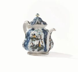 in maiolica, forma costolata con coperchio sagomato, ansa ad ampia voluta e beccuccio fortemente arcuato, piede largo e basso. Il decoro con piccoli paesini cinesi, cosiddetto a ponticello, si alterna con un motivo alla francese delineato in blu di cobalto. Sul fondo etichetta Collezione Paolo Candiani n. 734; cm 17,5x20,5x13