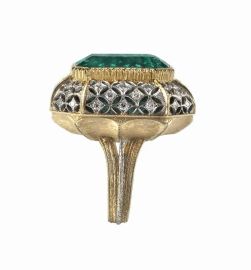 montatura cesellata in oro bianco e oro giallo, al centro del castone bombato, traforato e decorato da brilanti, è montato uno smeraldo rettangolare a contorno ottagonale di ct 25,9, corredato di certificato Cisgem n. 16223/002 - 019058 che ne attesta la provenienza Colombia, punzone 750, g 32