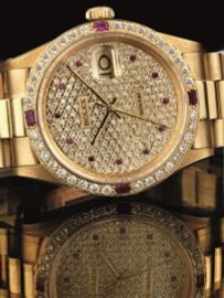 Cassa oyster in tre corpi in oro lucido e satinato, fondello e corona a vite, lunetta in oro decorata da una linea di brillanti e quattro rubini baguette, vetro zaffiro. Quadrante in pavè di brillanti con indici applicati in rubini, lancette a bastone oro con inserto in materiale luminescente, secondi al centro, datario a ore 3. Movimento a carica automatica calibro 3035. Bracciale in oro giallo 18 kt a maglie President, chiusura deployante a scomparsa, cassa, quadrante e movimento firmati