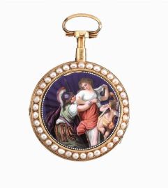 Cassa in oro giallo con lunette posteriore e anteriore decorate da una fila di perle, al centro una miniatura con scena allegorica in policromia. Quadrante in smalto bianco con numeri arabi, apertura per la carica a ore 2. Movimento con scappamento a verga, rimessa dell’ora e carica a chiavetta, quadrante e movimento firmati