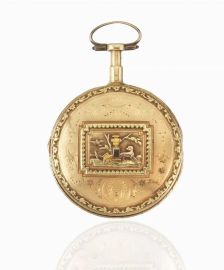 Cassa in oro dei due colori interamenmte cesellata a motivi vegatali, il retro è centrato da una riserva rettangolare entro cui è raffigurata una scena campestre con cane e frutta, pulsante per la ripetizione a ore 12. Quadrante in smalto bianco con numeri arabi Breguet, apertura per la carica a ore 2, lancette traforate. Movimento con scappamento a verga, quadrante e movimento firmati