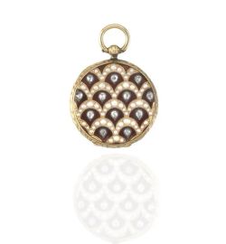 OROLOGIO DA TASCHINO BOURSIER, PARIS, SEC. XIX, IN ORO GIALLO 18 KT, SMALTO, PERLE E DIAMANTI