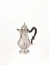in argento, corpo piriforme bombato e sbalzato a costolonature, presa in legno intagliato a volute, finale del coperchio a trottola, alt. cm 25,5, g 770
